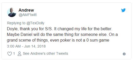 推特大意:Doyle,谢谢你的《超级系统》。它更好的改变了我的生活。也许有人会从大丹牛那里得到和我一样的东西。在事情的宏大计划中,扑克并非是零和博弈(zero-sum game)。