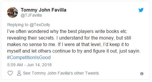 推特大意:我之前很好奇为什么顶尖牌手都会写书来揭露他们的秘密。为钱我能理解,但始终这些书对我没什么用。如果我处在那个层次,我会让自己保持那个水平并鼓励其他选手继续尝试,只是说说而已。