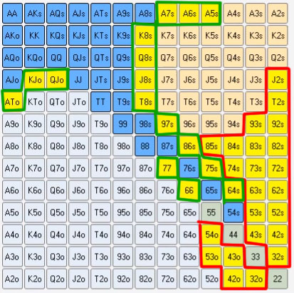 l 对抗用100%起手牌率先加注但频繁对3bet弃牌的对手——用蓝色标记底牌和红色线条框选底牌做3bet,用绿色标记底牌跟注。