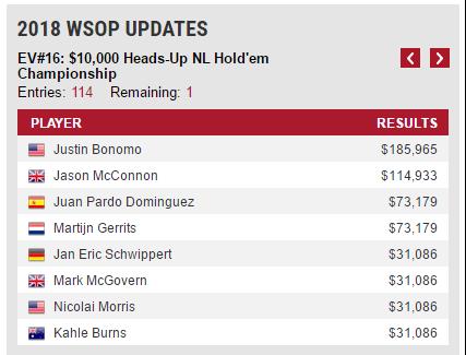 在前6手牌中,McConnon占据着筹码量上的领先优势,但Bonomo在第7手牌中扭转了牌况,并一路领先到底。在第59手牌时,Bonomo的筹码量是McConnon的7倍有余,McConnon(Q-9)知道自己没有希望了,而Bonomo也凭借着底牌4-4赢得了比赛胜利,收获了个人扑克生涯的第二条WSOP金手链。