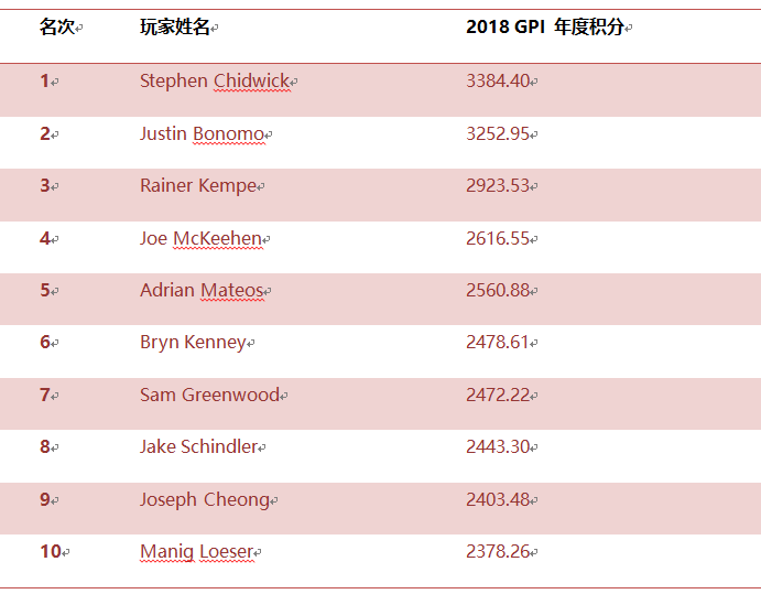 2018 GPT年度玩家排行榜在一个月之前的第一名是Stephen Chidwick,这位英国职业牌手仍然是此次的第一名,从今年4月份开始他已连续八周蝉联该宝座。
