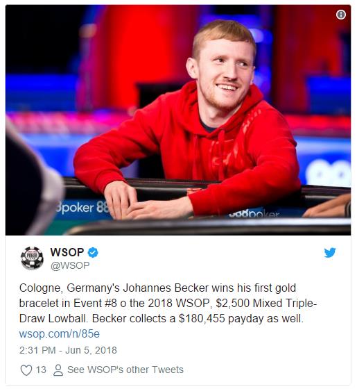 德国玩家Johannes Becker是去年WSOP$50K扑克玩家锦标赛的亚军,在今年WSOP第8项赛事$2,500混合三次换牌赛事中以筹码量最少选手的身份进入比赛最后一轮并在终极环节击败Scott Seiver取得比赛冠军,奖金$180,455。