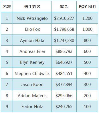 以下是决赛桌的最终结果和年度最佳选手(POY)积分情况: