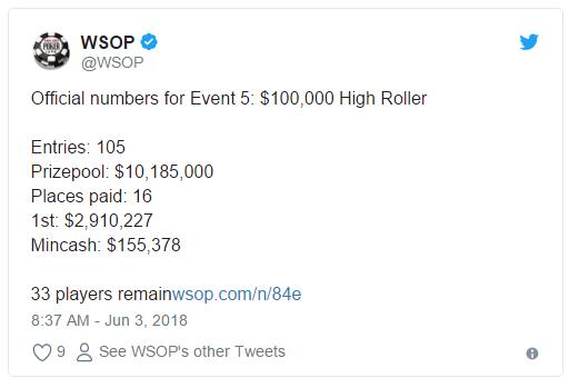 Ivey是在该赛事的Day2报名入赛,截止报名时间买入105人。他的开局情况不是太理想,在赛事第13个级别被Stephen Chidwick淘汰出局,获得比赛第27名。