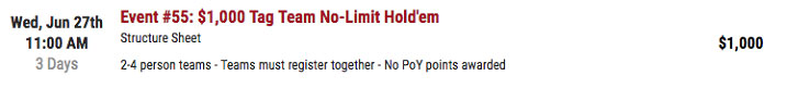 今年双人组团赛(Tag Team Tournament)的买入费又降到了1000美元。许多牌手热爱这项赛事,值得一提的是,UpswingPoker的两位站长Doug Polk和Ryan Fee曾在2016年联手拿下这项赛事的冠军。