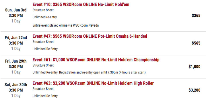 今年WSOP.com将举办总共四个网络扑克赛事。如果你不想每天坐在冰凉的里约赌场,那么你可以考虑报名这些赛事,在自己的酒店房间内惬意地比赛。