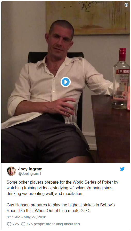 Gus Hansen的准备工作有点另类,比如伏加特和美女的膝上舞,什么GTO早被抛到九霄云外了。能看出他是遵从自己内心的一个人,不会为了WSOP而放弃向往的生活,该吃吃该喝喝,高兴干啥就干啥。