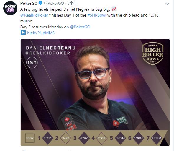 但他的好友Daniel Negreanu大丹牛顺利晋级,并且是Day 1的筹码量领先者,筹码量高达161.8万。
