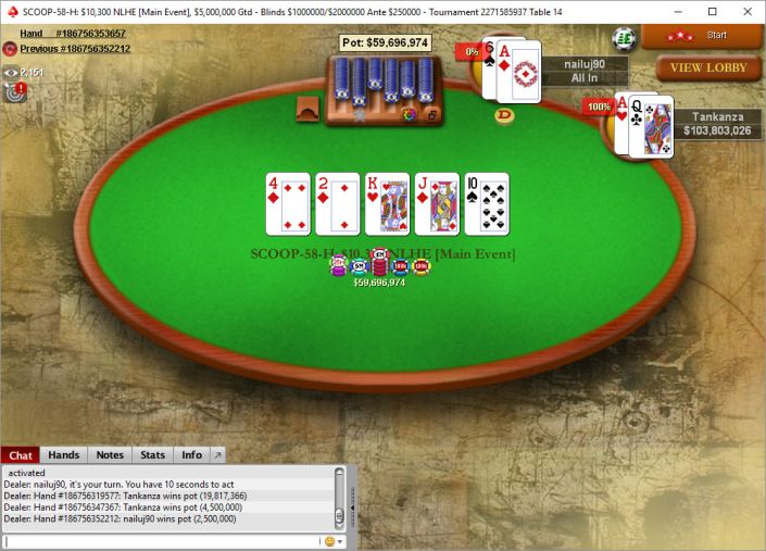 最后一手牌发生在当地时间下午5点,Stuer在河牌圈错失同花成牌,而Tanzanka坚果顺子成牌,成功收获百万奖金从而宣告比赛的结束。