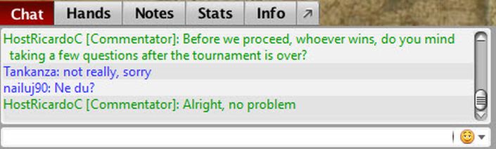从有效的资料来看,Tankanza并没有透露自己的真实姓名,在去年取得了过一场WCOOP的胜利。在早期与 nailuj90 的聊天中就有点拒绝回答提出的问题,看来警惕性很高。