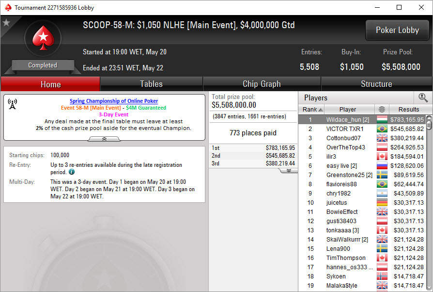 这场胜利让人看着着实诡异,Niklas ‘Lena900’ Astedt, Chris ‘Big Huni’ Hunichen和Max ‘mikki696’ Lehmanski等高手都“甘拜下风”,在单挑环节诞生之前,筹码量领先优势均在这些选手之间来回传递。