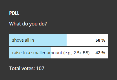 因为只有16BB筹码,在枪口位置率先全压绝对是有利可图的,因此弃牌不是一种选择。问题是,是否加注到较小数目能获得更高利润。