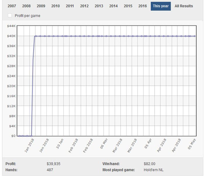 今年1月,为了尝试刚刚学到的新知识,“大丹牛”再度在扑克之星现身。这次他取得了不错战绩,在不到500手牌内赢了4万美元。
