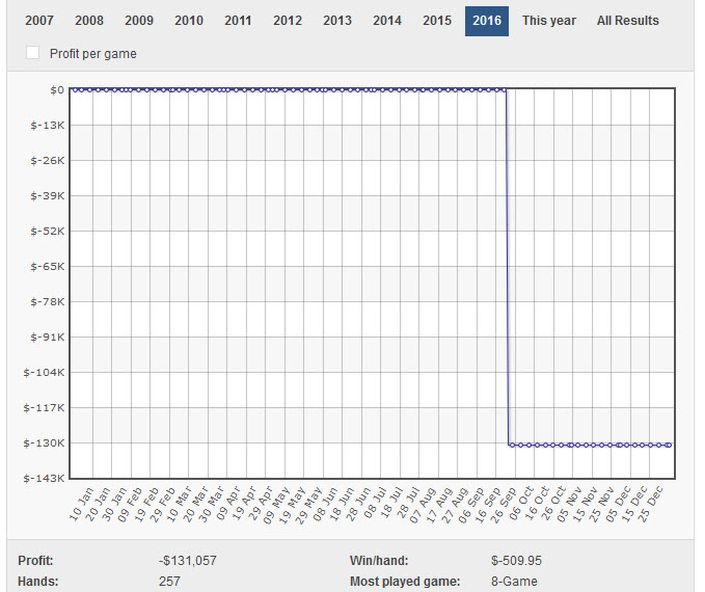 虽然这笔亏损相当于他3654万美元的现场锦标赛收益不过是九牛一毛,但“大丹牛”从2010年底首次现身网络扑克以来一直在输钱。有意思的是,查看“大丹牛”的具体对战信息时,我们发现他和Isidur1等网络扑克交手鲜有胜绩。