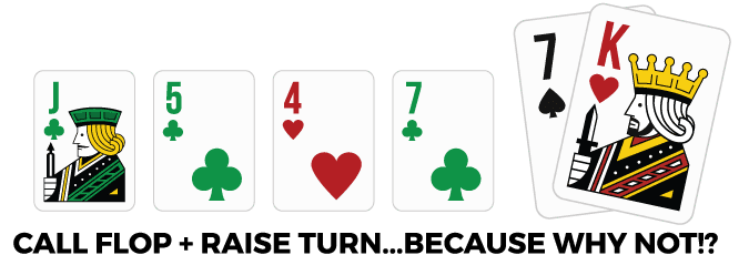 但扑克新手根本不理解这种动态。他们可能在翻牌圈用未击中对子的K7o跟注,然后决定在转牌圈击中一张7时加注。