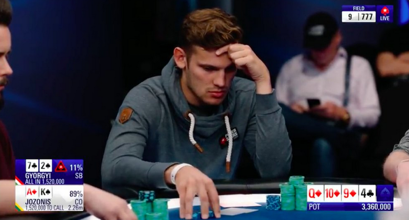 Jozonis以手握300万的筹码占据着牌局优势,3bet之后Gyorgyi手里只剩200多万筹码。