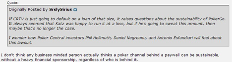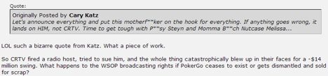 Cary Katz,在今年1月的扑克之星加勒比海奇遇赛事$100k超高额豪客赛中收获了接近150万美元的奖金,据他自己表示在过去的18个月中CRTV以公司的名义向他借了2000万美元,让彼此都不愉快的是公司方面至今都没有还钱的迹象。