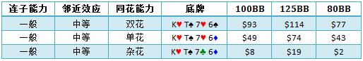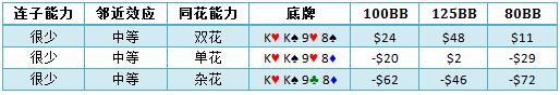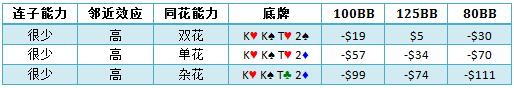 在表6.3,我们可看到K ♥ K♠ 9♥ 8♠在100BB筹码量可盈利2.5BB,但假设去掉它的一个同花,则跟注不再有利可图。在表6.4,我们可看到即使K ♥ K♠ T♥2♠是双花底牌,但因为它的高邻近效应和低连子能力,它仍然无法盈利。因此,在你养成用任何双花KK底牌跟注的习惯之前,确保也考虑到你的底牌的邻近效应和连子能力。