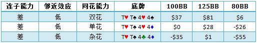 3. 邻近效应强到足够使杂花K-Q-J-T和杂花Q-J-T-9在100BB有效筹码量跟注4bet都是亏损的。轮子底牌也受到邻近效应的伤害,虽然它们极少做3bet。边缘A高底牌对抗标准4bet范围通常应该弃牌。