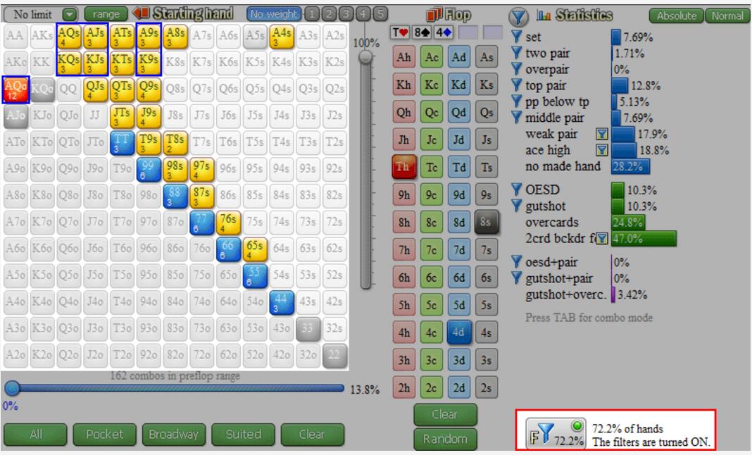 如同我们的第一个例子,我把所有带后门同花听牌的两张高牌和A9、K9加入我们的跟注范围。但鉴于对手这次只下注半个底池,我们应该用更多底牌做飘浮跟注。因此,在这个例子中,为了正确防守对手的持续下注,我也把全部AQ组合加入我们的跟注范围。