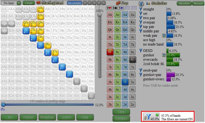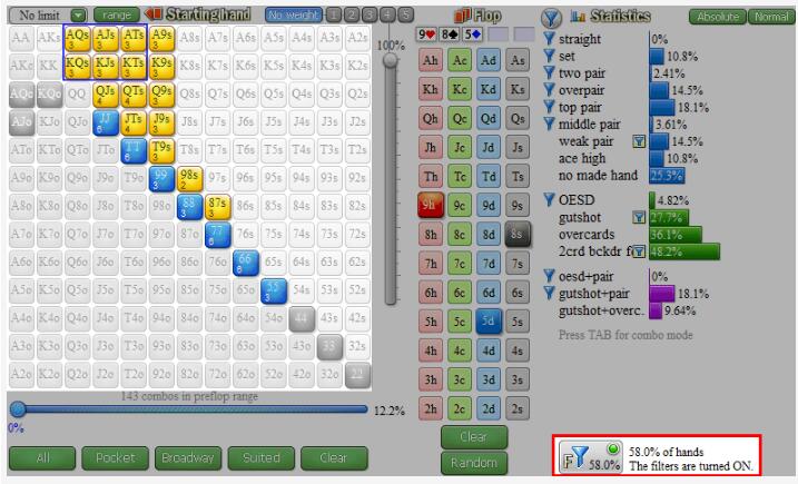 我们将跟注的底牌包括:所有带后门同花听牌的AQs,40%带后门同花听牌的AJs,30%带后门同花听牌的ATs,50%带后门同花听牌的KQs,15%带后门同花听牌的KJs及KTs。
