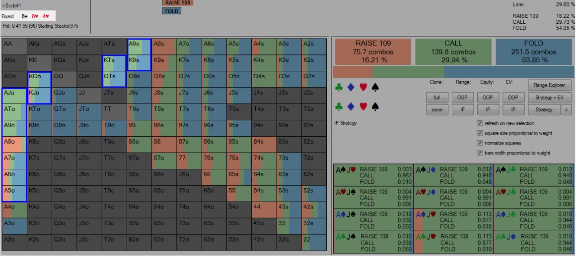 我们来看看,对抗一个75%底池大小的平衡下注,我们的飘浮跟注范围应该是什么样子。(你可以通过放大图片查看细节信息。)