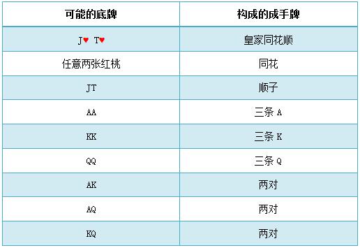 例如,如果翻牌是A♥ K♥ Q♥,则存在这些可能: