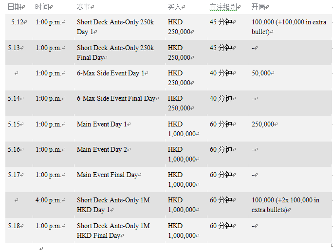 为期两天的HKD 240,000+10,000短牌赛事将在5月12日开赛,开局100,000。5月17日,HKD 960,000+40,000短牌赛事开赛,开局100,000。