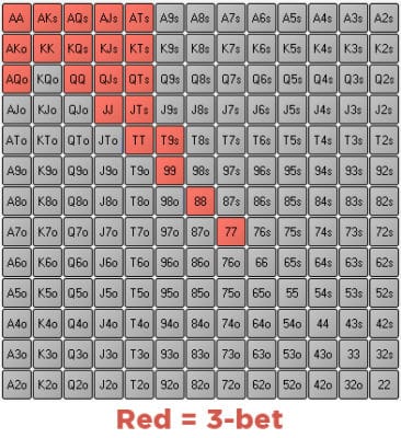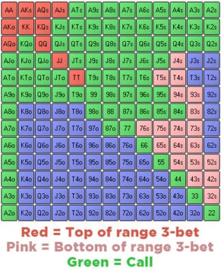 两极化3bet范围由我们继续游戏范围中的顶端牌和底端牌构成。以下是两个你应该使用两极化3bet范围的极常见场合。