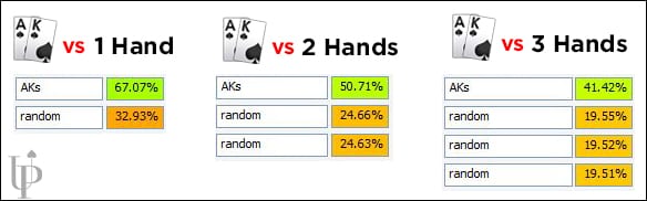 随着进入底池的玩家越来越多,你的范围的胜率也会随之减少。我们来看看AK分别对抗一手、两手、三手随机牌的胜率:
