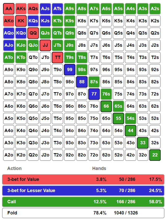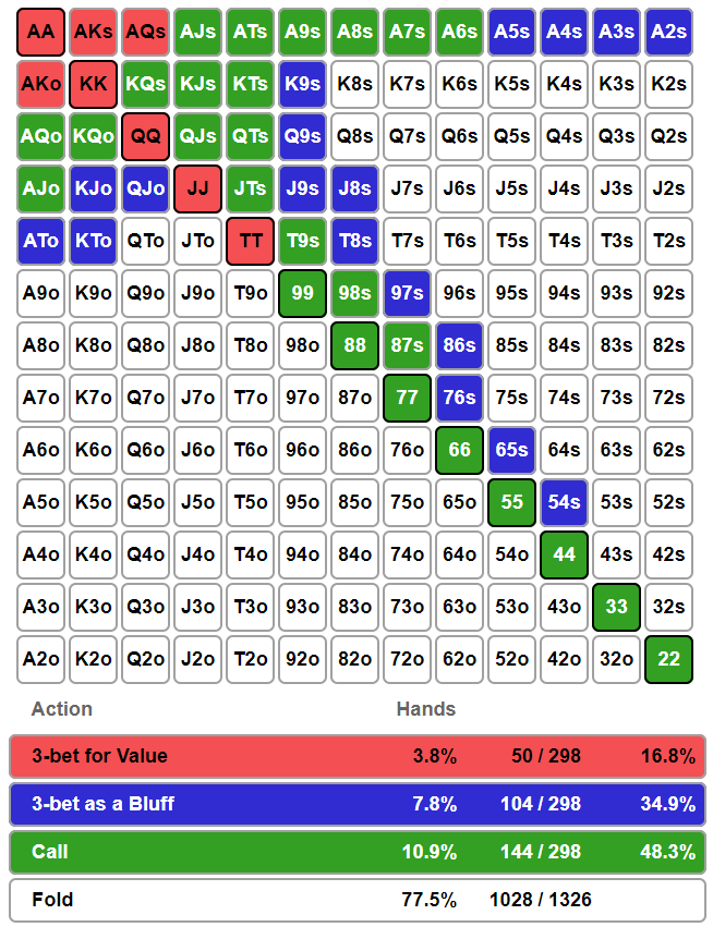 如果你预计对手对你的3bet要么弃牌要么4bet,你应该用两极化的范围做3bet。这个范围包括你最好的牌,比如AA、AK,以及跟注对手的初始加注不是特别好的牌,比如A♦ 4♦、K♦ T♠、T♥ 8♥和5♦ 4♦。注意,当你执行这种策略时,你将用能很好击中翻牌的底牌跟注,比如AJ、KQ和8♠ 7♠。这种策略非常奏效,因为当你用弱牌做3bet时,你预计很少能看到翻牌。拿着AJ、KQ这样的牌时,你通常希望去看翻牌,而跟注确保大多数时候会发生这种情况。