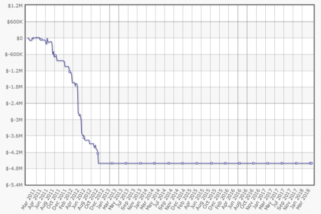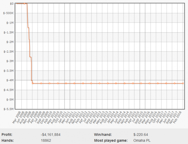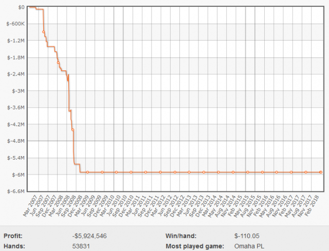 这是Guy Laliberte扑克之星的账号,活跃时间为2011年1月到2012年10月,这应该是他最活跃的一个账号,牌局数123,261,亏损$4,607,380,平均每手亏损$37.37。