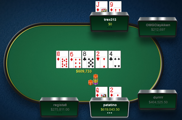 翻牌圈三人弃牌,Hac "trex313" Dang和patatino进入了翻牌10d-6d-8c的加注对弈。双方均有300大盲的样子,翻牌圈底池$609733。Dang的底牌为Jd-9d,两头顺子听牌;patatino底牌为Qd-2d,暂时处于下风。转牌为2h,河牌为4c,patatino以2对子牌组赢得该局底池。