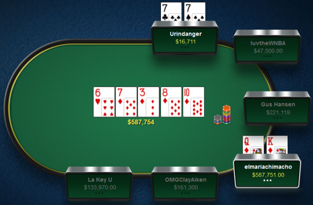 这局牌中有大家熟悉的玩家,转牌圈剩三人,公共牌中有三张方块,elmariachimacho同花成牌。Galfond选择了弃牌,而Dang却选择了强势加注,最终全押。河牌为一张方块10,而Dang的底牌是对7,elmariachimacho斩获此局胜利,获得底池$587,754。