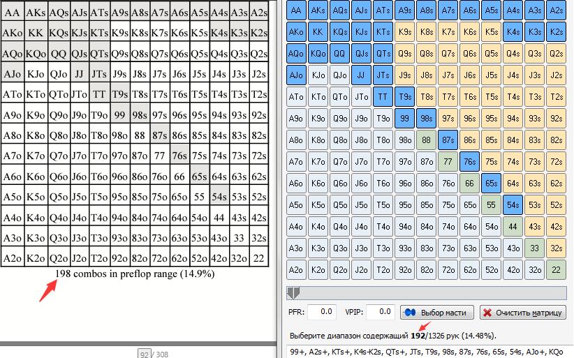 我明白你的疑惑。你也可以有一个线性的跟注范围。这可能产生在下面的场合——因为加注不满足高效加注的两个原因,你面对一个下注要么跟注要么弃牌。在“按钮玩家在K♦ K♠ 2♥翻牌面的跟注范围”那一段我想说的是,当你面对一个持续下注时,你很可能不应该频繁加注。那是因为,任何强到足够加注的牌很可能包括一张K,而如果你有一张K,你不容易被翻盘,而且你减少了对手范围中的一半强牌(这意味着对手很可能在诈唬,如果你只是跟注,他可能会继续诈唬)。但我明白之前解释让人困惑的地方(虽然它是正确的),如果你只加注、下注而不跟注,你将有一个线性的范围。如果你只跟注而不加注,你可以有一个线性的范围,这也是正确的。