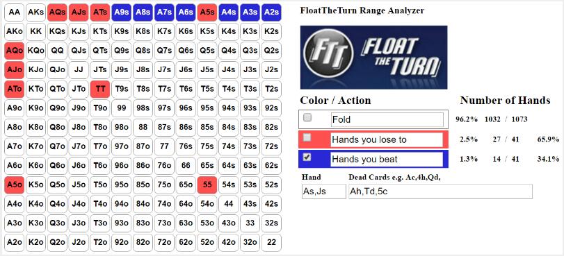 即使对手用部分Ax组合(蓝色标记的底牌)check-raise,你仍然在66%的时候被打败。如果对手碰巧用带后门同花听牌的卡顺听牌check-raise,平均而言你仍然拿着比他差的牌。只有对手用所有Ax组合去check-raise时,继续玩下去者是有意义的,而这种情况很少发生。