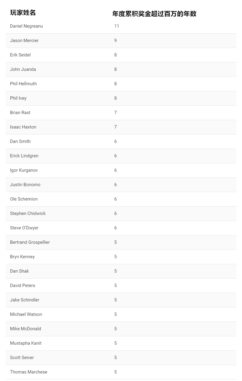 如果你想知道这类玩家到底有何出众之处,那么就看看下面这张表吧。下图给出的数据是从2000年开始至少有五个年头的年度累积收益分别超过100万美元的,一共有25位牌手。而排名全球扑克金钱榜榜首的大丹牛Daniel Negreanu也是该榜的第一名。