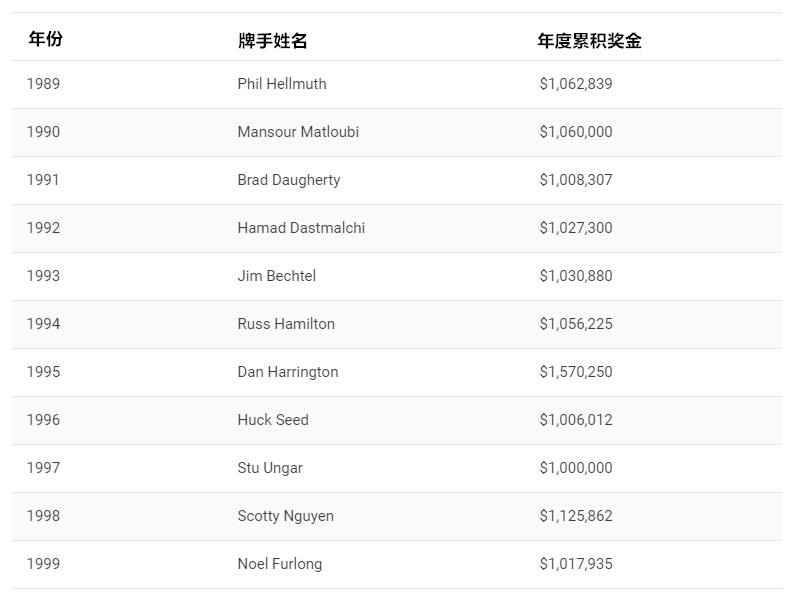 信不信由你,扑克史上首位年度累积奖金突破100万美元的玩家是Phil Hellmuth。他在1989年取得WSOP主赛事冠军,奖金$755,000,当年他打入了14场赛事的钱圈,取得了其中4场赛事的冠军(包括WSOP主赛事),年度累积奖金106万美元。