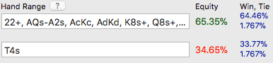 对抗这个范围我们的T♠ 4♠ 约有34.7%的胜率。