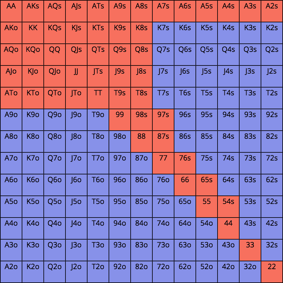 假设有一个现金扑克局,我们在大盲位置拿着T♠ 4♠,劫位玩家率先加注到2.5BB。我们估计他的范围如下: