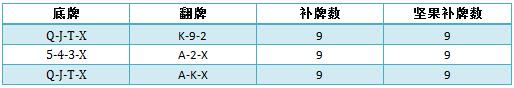 最后,拿着一手强顺子听牌时,如果碰到了暗三条,给它增加一个同花听牌不会为它提供太多额外胜率。简而言之,随着顺子听牌补牌的减少,给一个顺子听牌增加一个同花听牌会使其胜率增加很多。例如,对抗一个暗三条,当一个在彩虹翻牌面有20张补牌的包裹听牌得到同花听牌时,其胜率只从54.4%上升到57.9%。这是因为,不管包裹听牌是否拿到额外的同花听牌,暗三条都会在对子公共牌面获胜。更简单地说,不管听牌有多大,暗三条总是确保握有38%来自对子公共牌面的胜率。