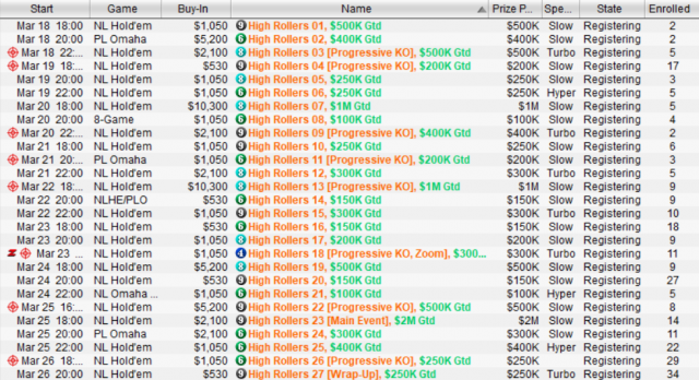 第二届PS $10,000,000豪客系列赛将于3月18日(周日)WET时间18:00开赛,首场赛事为$1,050 NL $500k GTD,3月26日以$530 NL $250k GTD开场,闭幕赛为$2,100 NL主赛,保底奖池200万美元。