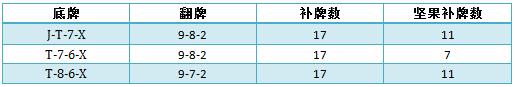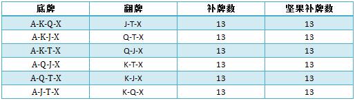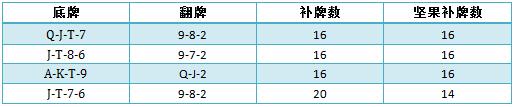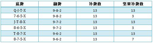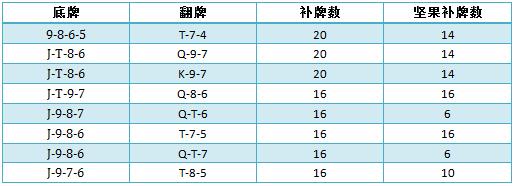 你将注意到,所有这些听牌都是16-20张补牌的超级包裹听牌。需要重申的是,你寻求的最重要的因素是补牌的质量,而非补牌的数量。同样,需要注意,坚果补牌的数量与底牌之间的间隔在哪直接相关。拿着间隔在底端的底牌总是比拿着间隔在顶端的底牌好。