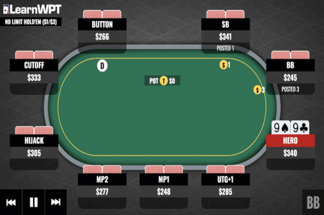 我们对于对手底牌范围的推测明显影响了9♠ 9♣ 在这手牌的理想玩法。对抗一个1/3美元现金局的未知对手,通常弃牌就好。