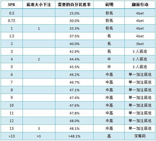 接下来的一页是我为你们制作的一张SPR表格。这是Jeff Hwang的扑克书《Advanced Pot Limit Omaha》中的某个表格的变体。该书绝对是一本优秀的扑克读物,如果你没有看过,建议去看一看。