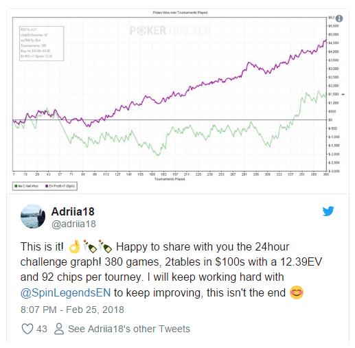 Adria 'Adriia18' Diaz Dalmau,在一家扑克网站担任导师,具有职业水准的他此次完美的完成了目标,挑战最终的平均投资回报率高达12.39%,平均收益 $4,708,报名选手380人,每人买入$100。