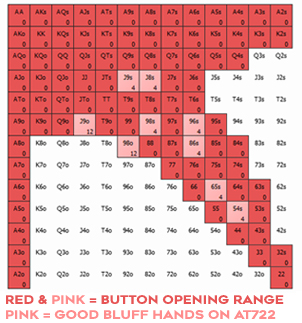 上图中用粉红高亮显示的诈唬牌共有52种组合,这意味着我们为了保持平衡不得不放弃刚好3种诈唬牌组合。切记,实际上保持完美平衡通常是不必要的(特别是在小注额级别)。