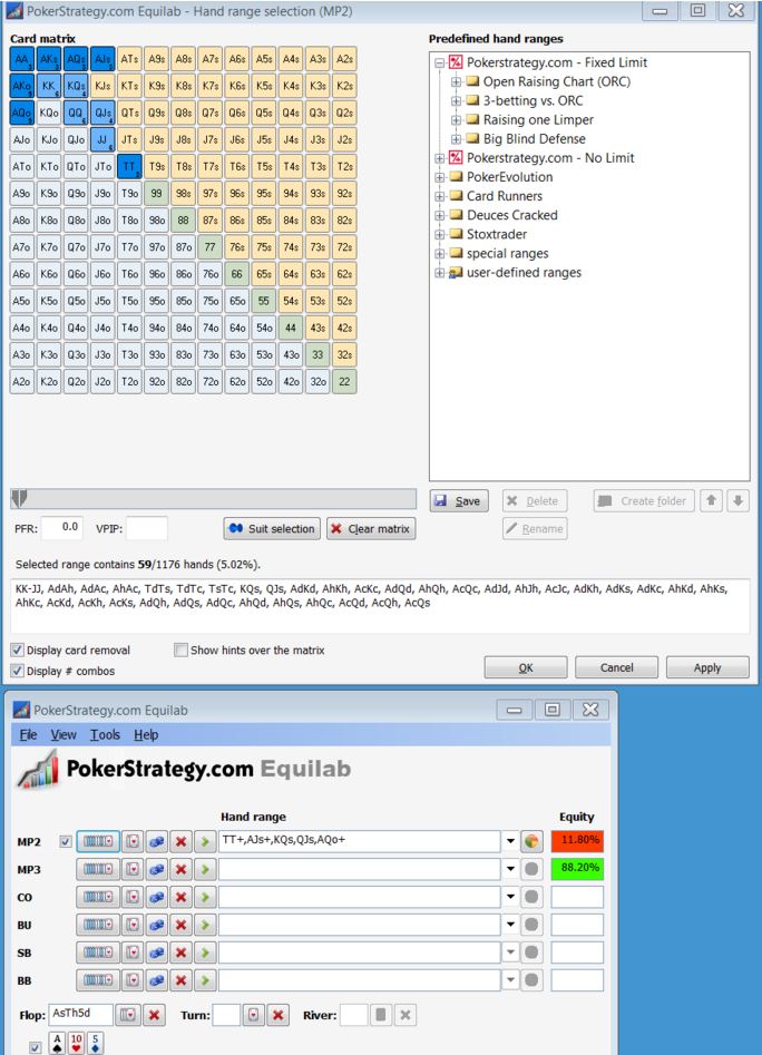 我们利用Poker Ranger软件来查看这些范围看起来是什么样子,以及它们会如何影响我们接下来的策略: