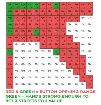 为了回答这个问题,我们需要对按钮玩家的翻前率先加注范围和大盲玩家的跟注范围有个大致的了解。
