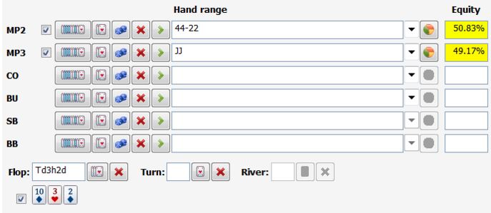 如果我们往100美元的底池下注75美元,而Rafi加注到225美元,根据我们的底池赔率,我们需要至少27%的胜率才能跟注。我们来计算拿着高对JJ对抗Rafi预计范围(44、33和22)的胜率。